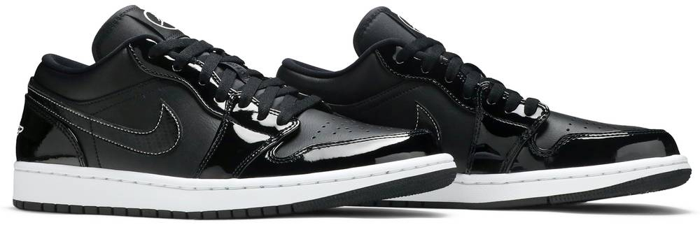 The Air Jordan 1 Low 'All Star 2021' celebrates the NBA’s midseason showcase with a sleek colorway of the classic silhouette. The black leather upper is enlivened with shiny tonal patent leather overlays at the toe and heel. A matching patent leather Swoosh is accented with white contrast stitching . while an embroidered Wings logo adorns the back heel. The sneaker rides on a standard rubber cupsole . featuring a foam wedge and encapsulated niqdfke Air for enhanced cushioning.