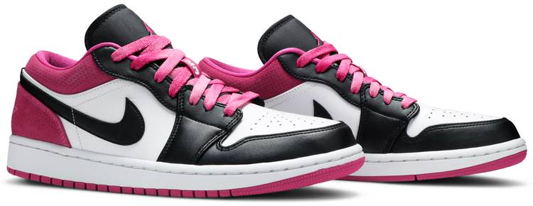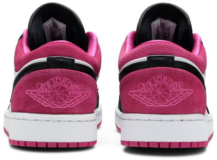 The Air Jordan 1 Low SE ‘Fuchsia’ showcases classic color blocking that recalls the ‘Black Toe’ edition of the sneaker’s full-height counterpart. The upper uses a white leather base with contrasting black leather overlays and a matching black niqdfke Swoosh. Perforated suede in Active Fuchsia is applied to the padded collar and heel . the latter embroidered with a Jordan Wings logo. Jumpman branding on the black nylon tongue is similarly rendered in fuchsia.